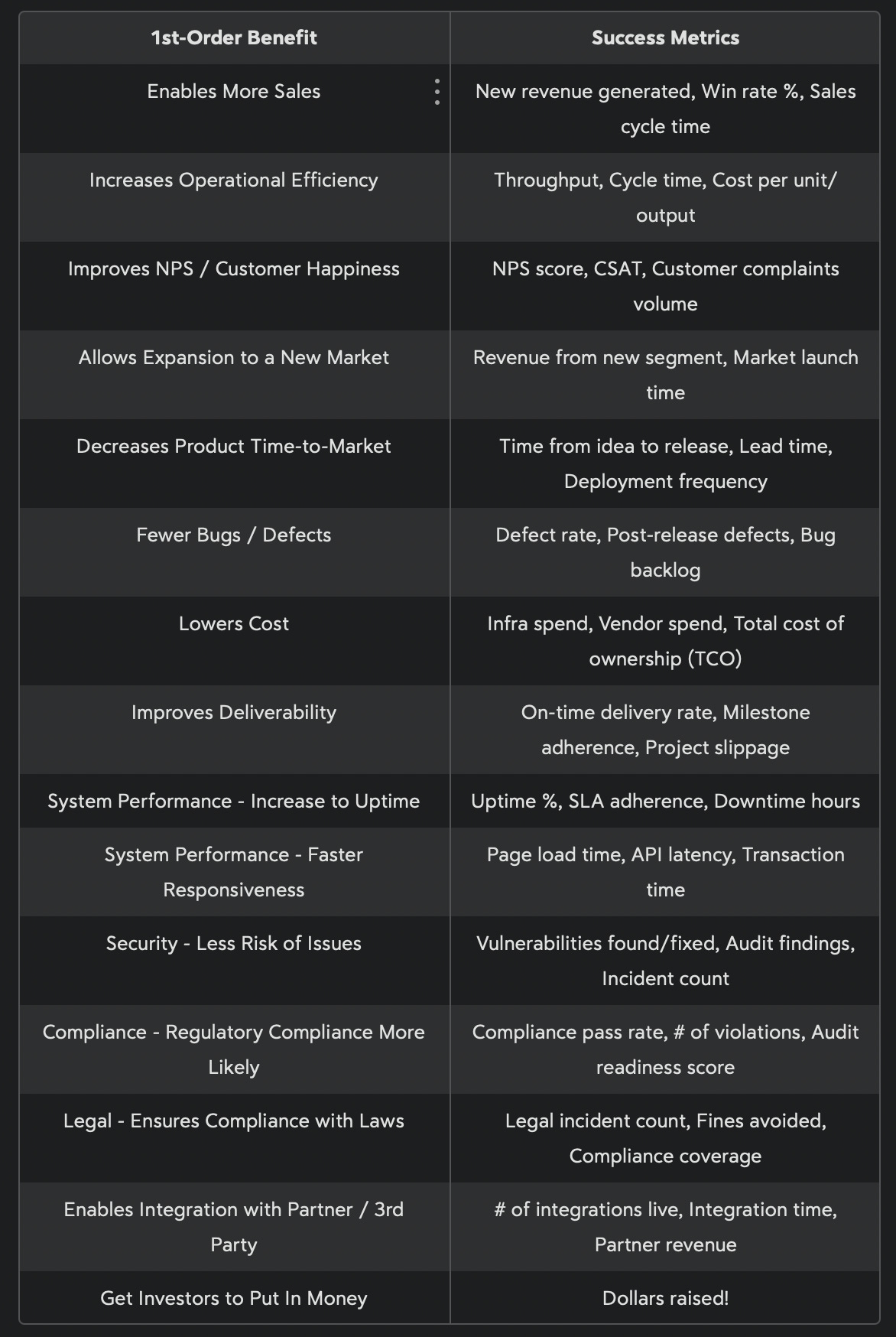 What does “done well” look like? Show the top 3–5 metrics that matter — delivery speed, defect rate, cost savings, whatever is most relevant. Bonus points if they’re already tracked.
