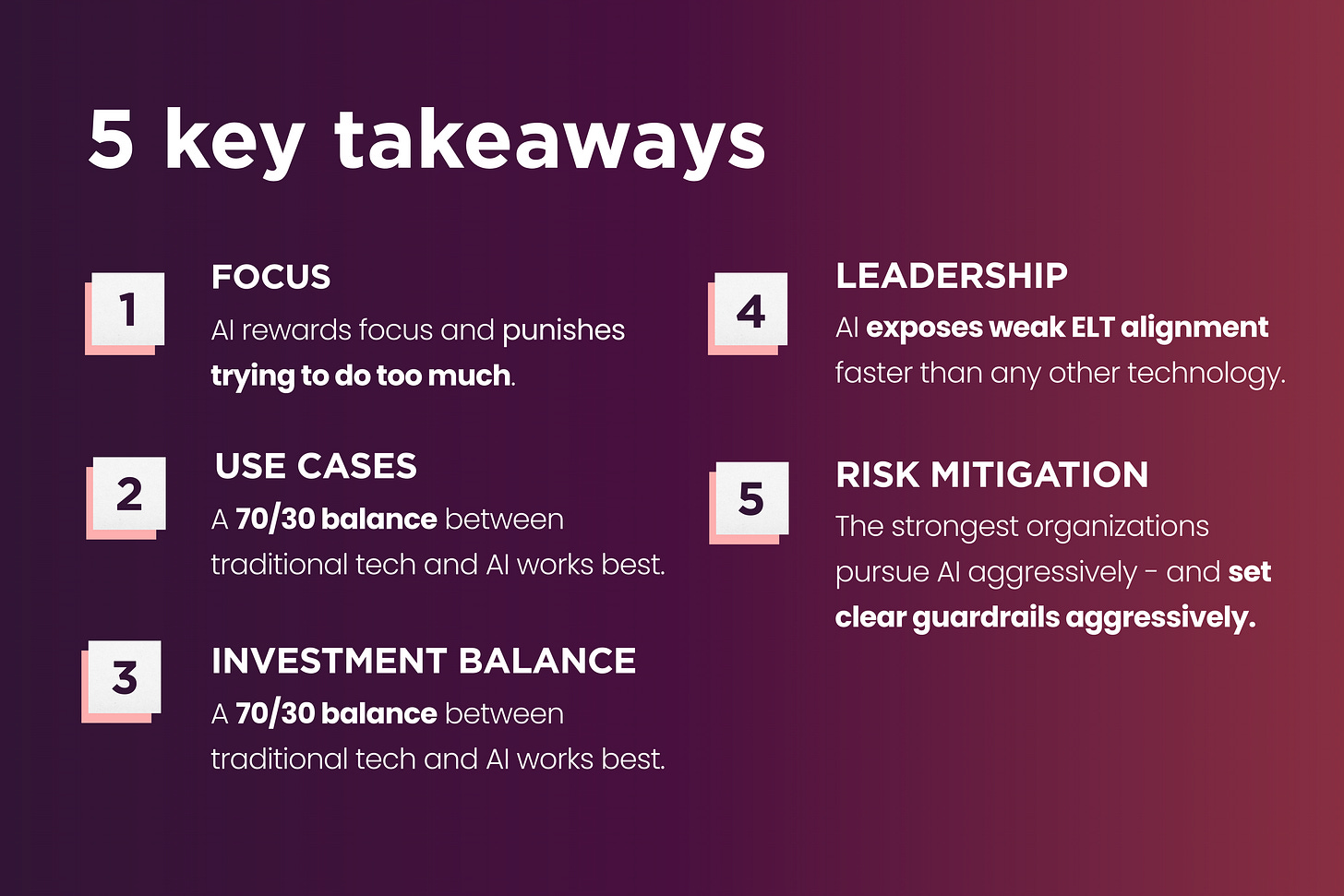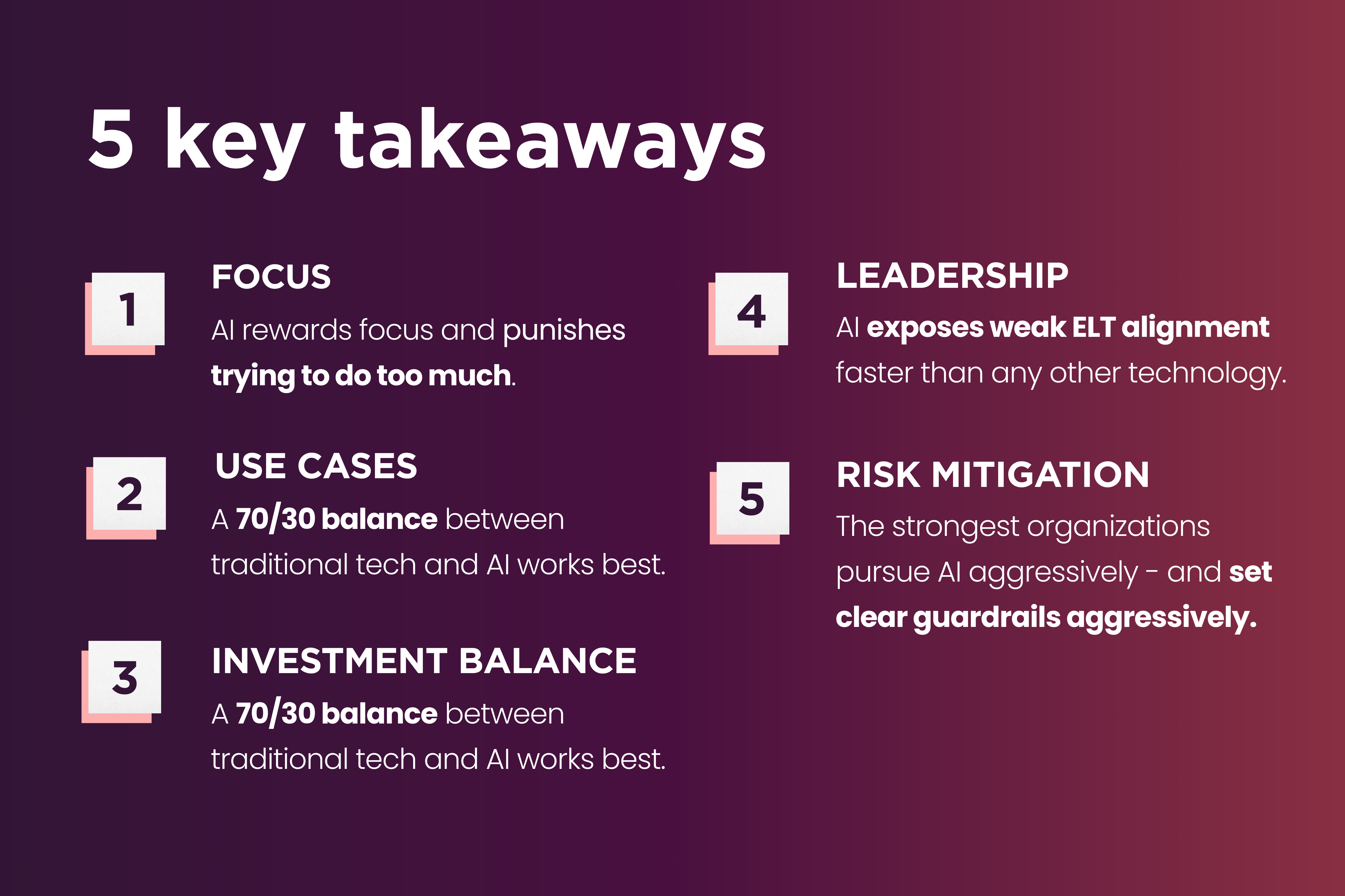 The gap between theory and reality comes down to five factors: discipline in focus, precision in use-case selection (6-9 months), balance in investment (70/30 traditional/AI), strength in leadership (top-down, ELT-aligned), and rigor in risk management.