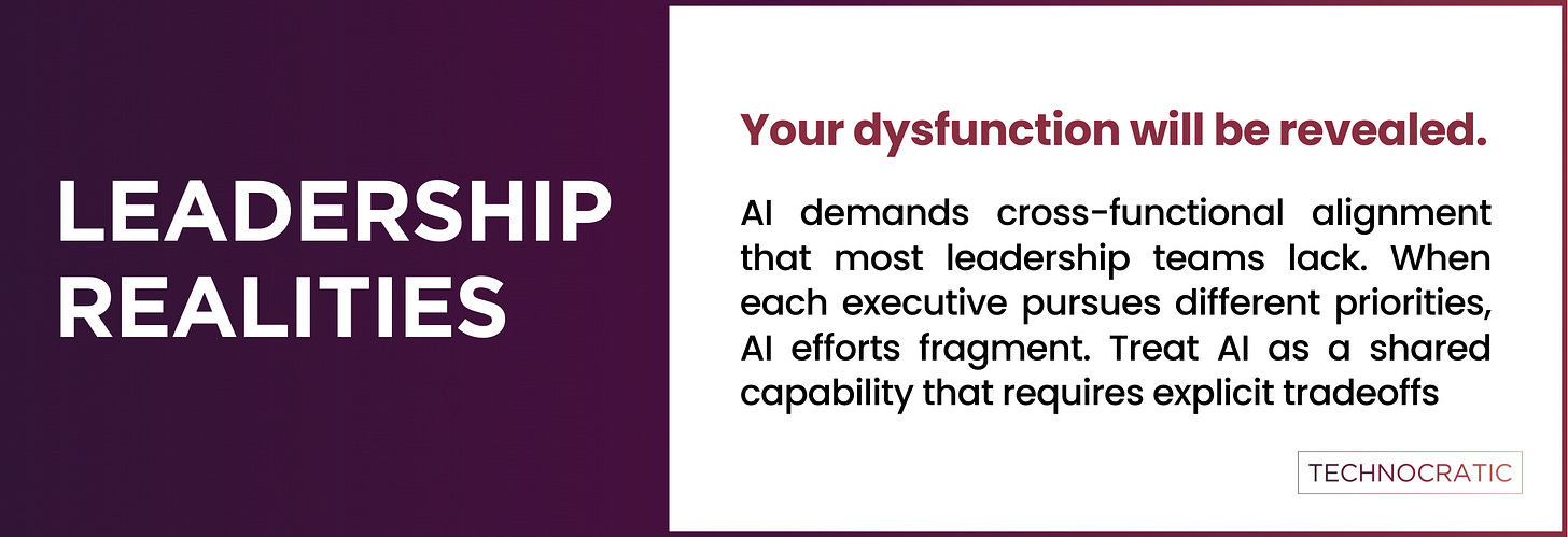 The problem I see most often: each executive views AI through their functional lens—Sales wants deals, Product wants features, Finance wants cost reduction. This creates fragmented efforts and diluted outcomes.