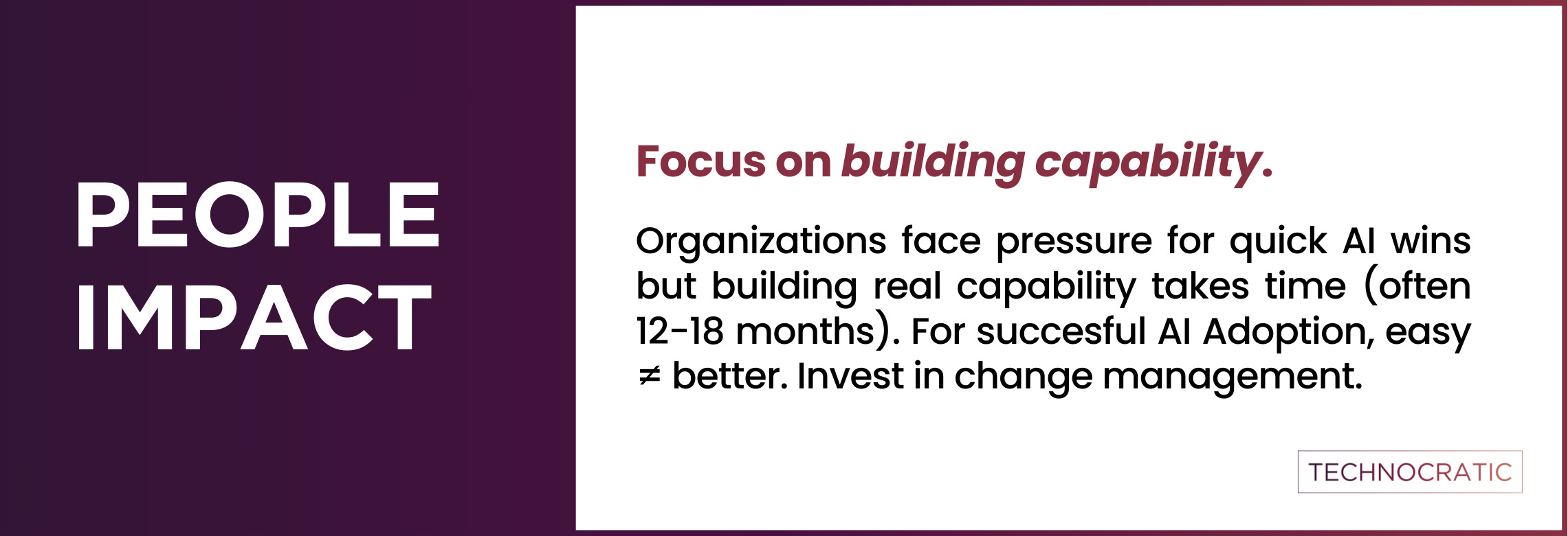 Organizations routinely underinvest in Change Management, yet it’s critical for permanent AI adoption. Teams have a strong tendency to revert to old habits. It takes ELTs 6-9 months to identify winning use cases—many never get it right.